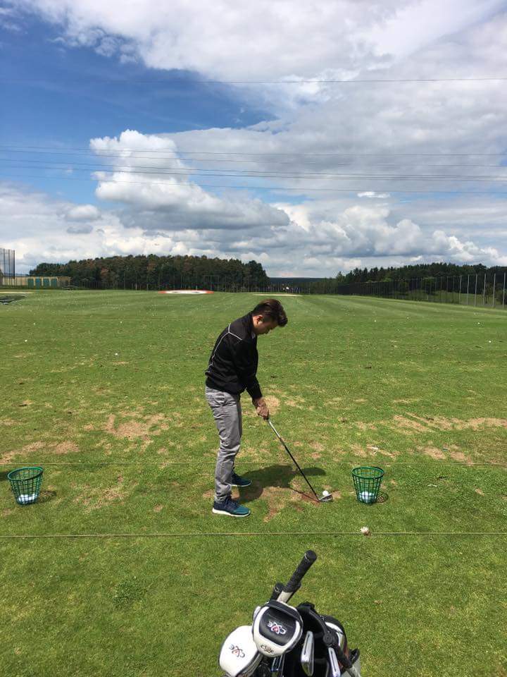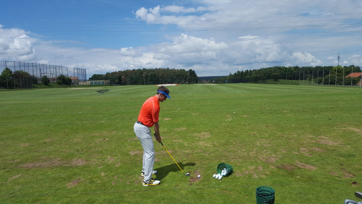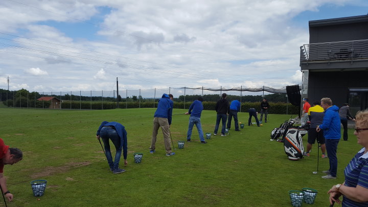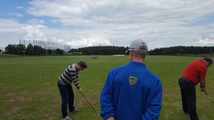 Um 13 Uhr ging es nach einer kurzen Einführung und Erklärung der Grundbegriffe direkt auf die Driving Range. Dort wurden uns erst mal die Schläger gezeigt und etwas die Unterschiede sowie Einsatzzwecke erklärt. Mit einem Eisen 6 durften wir uns dann in 2er Gruppen versuchen die Bälle aufs Feld zu befördern. Hört sich leichter an als es ist. Sicherlich hätte ich mit bei den ersten Schlägen den Ball mit Fingerschnippsen weiter nach vorne bekommen als mit dem bestimmt einen Meter langen Golfgerät in meinen Händen. :-) Aber Lukas stand als geduldiger und erfahrener Trainer ja mit Rat und Tat zur Verfügung. Dort stieß dann Julian Wuttke, auch Snooker-Spieler bei uns im Verein und erfahrener Golfer, zu unserer Gruppe dazu. Er arbeitet ebenfalls im Golfclub "Center of Excellence". Julian und Lukas führten uns dann auch immer einige Schläge vor damit wir uns eine Vorstellung davon machen konnten wie es richtig aussehen sollte. Nach etwas Übung klappte aber schon das eine oder andere.