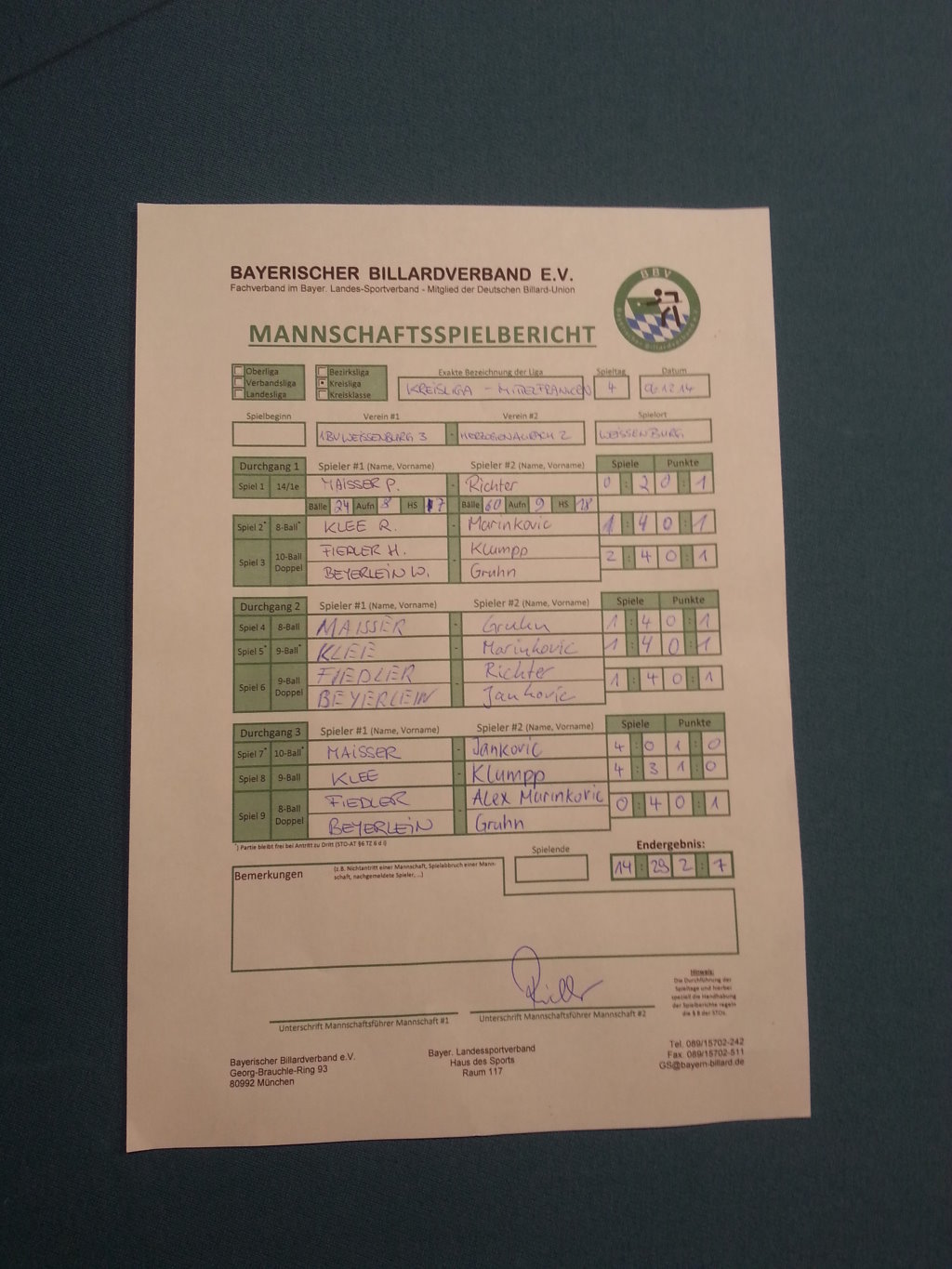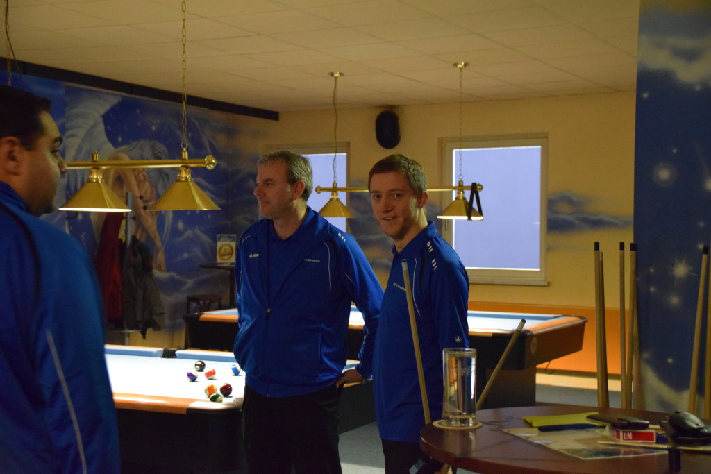 Für die ersten drei Partien hatten wir nun die Wahl zwischen zwei 14/1 Spielern, Klaus und Alex. Eigentlich wollte ich Alex den Vortritt fürs 14/1 lassen, aber vor Ort entschieden wir uns dann gemeinsam doch anders und ich sollte gegen Peter Maisser ins 14/1 starten, während Alex im 8-Ball gegen Roland Klee an den Start ging. Philipp und Lukas sollten im 10 Ball-Doppel gegen Hubert Fiedler und Wolfgang Beyerlein antreten. Luka setzte in dieser Runde daher aus. Das 14/1 startete ich mit einem nicht ganz geglückten Sicherheitsanstoß der von Peter direkt mit 5 Bällen gestraft wurde. Ich konterte aber direkt mit einer 18er Serie was vermutlich Peters Spielkonzept komplett ins Argen brachte. Die Partie ging recht offensiv weiter und konnte von mir dann klar in der 9ten Aufnahme heimgebracht werden. Alex marschierte ähnlich ambitioniert nach vorne wie ich. Die Anreise hatte ihn offenbar beflügelt und er konnte nahezu fehlerlos seinen Satz 4:1 gewinnen. Im Doppel schlugen sich Lukas und Philipp auch sehr erfolgreich und gewannen 4:2. Der Zwischenbericht in unsere WhatsApp Gruppe konnte daher 3:0 Führung für Herzogenaurach lauten!