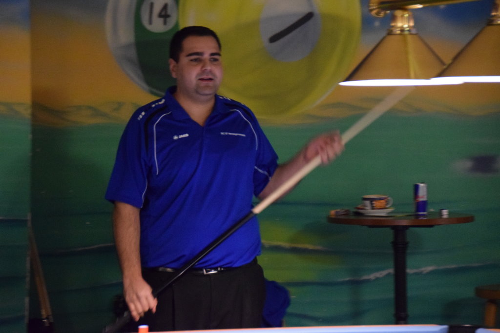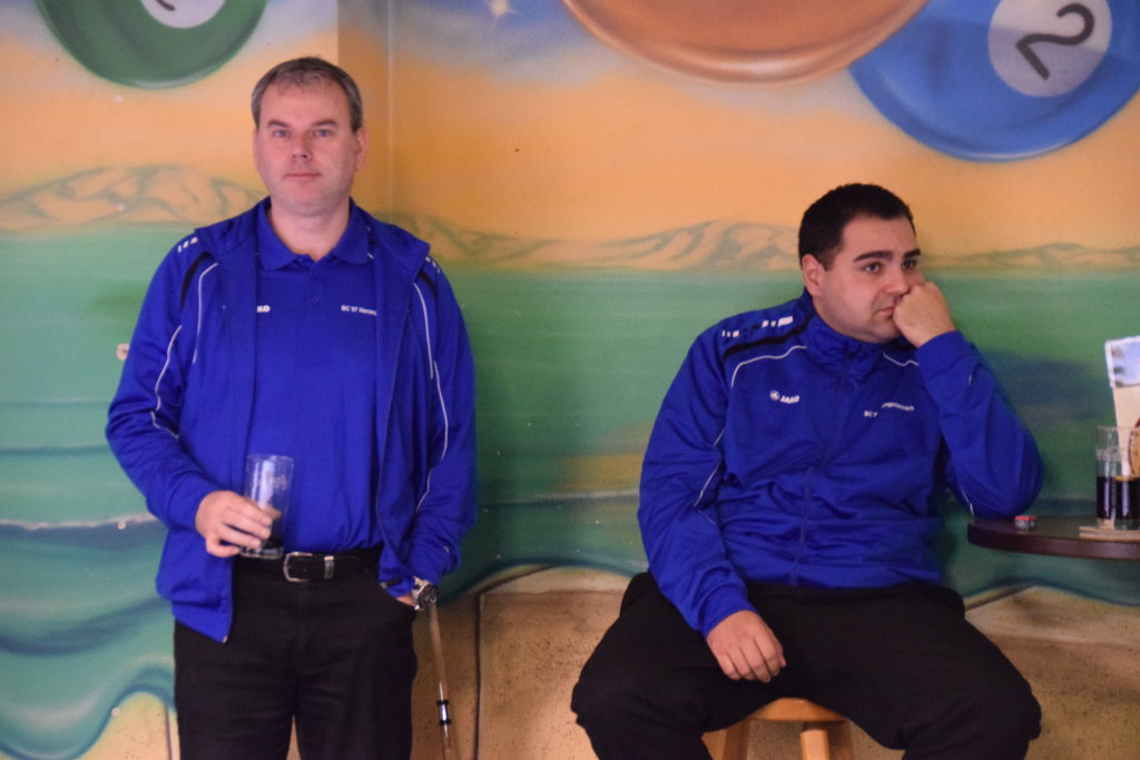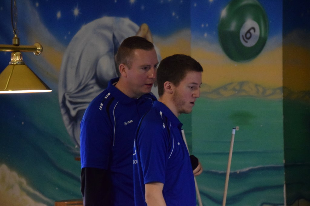 Der letzte Aufstellungsblock sollte nun Luka und Philipp in die Einzel bringen. Luka startet im 10-Ball gegen Peter, Philipp im 9-Ball gegen Roland. Ich setzte aus und Lukas und Alex spielten Doppel-8-Ball. Alex und Lukas harmonierten offenbar perfekt. Nahezu ohne Kommunikation spielten die beiden nahezu perfektes Billard. Richtig schön zuzusehen! 4:0 der Lohn solcher guten Harmonie. Luka hatte mit Peter einen sehr erfahrenen Gegner, der einmal ins Spiel gelassen nur noch schwer zu bremsen ist. Daher ein deutlicher 0:4 Verlust für Luka. Philipp konnte gut ins 9-Ball starten. Er gewinnt das Break, bleibt am Stoß, locht 1, locht 2 und spielt gezielt eine Kombi 3 auf 9 und geht in Führung. Leider sollte es dabei nicht bleiben, Roland erkannte seine Chancen und gewann an Sicherheit im Spiel, während Philipp manchmal mit zuviel Optimismus den einen oder anderen Ball lieber als Save hätte spielen sollen. Kurzum der Satz lief ziemlich ausgeglichen bis zum 3:3. Das letzte Spiel ging etwas hin und etwas her, Roland spielt noch die 7 und verstellt sich schwer auf die 8 kann aber eine gute Sicherheit ablegen. Philipp muss einen Vorbänder spielen den er nur knapp verfehlt. Mit Ball-in-Hand kann also Roland schließlich dieses erste Einzel von Philipp mit 4:3 gewinnen.