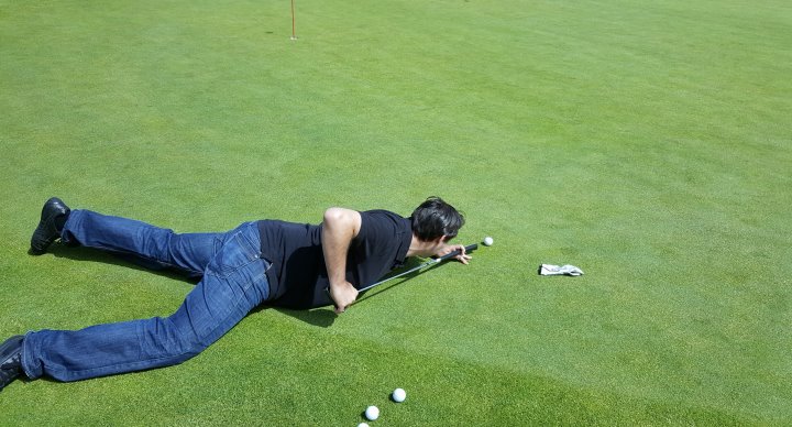 Beim Putten starteten wir dann noch mit unseren 16 Teilnehmern einen kleinen Wettbewerb. Wer kann mit den wenigsten Schlägen auf die letzten ca. 8m putten. Die meisten von uns brauchten dafür 3-4 Schläge. Als Gewinner konnte sich Claudia mit nur zwei Schlägen hervortun. Pokal hat sie zwar nicht bekommen, aber der Applause aller Teilnehmer war ihrer. :-) Sonderpunkte nicht ganz regelkonformer Art konnte sich unser Sportwart Adrian ergattern indem er den Putter kurzerhand verkehrtherum als Queue her nahm um auf Billard-Art den Ball ins Ziel zu befördern. Und siehe da, auf diese Art schaffte er es auch in nur 2 Zügen! Großartig!