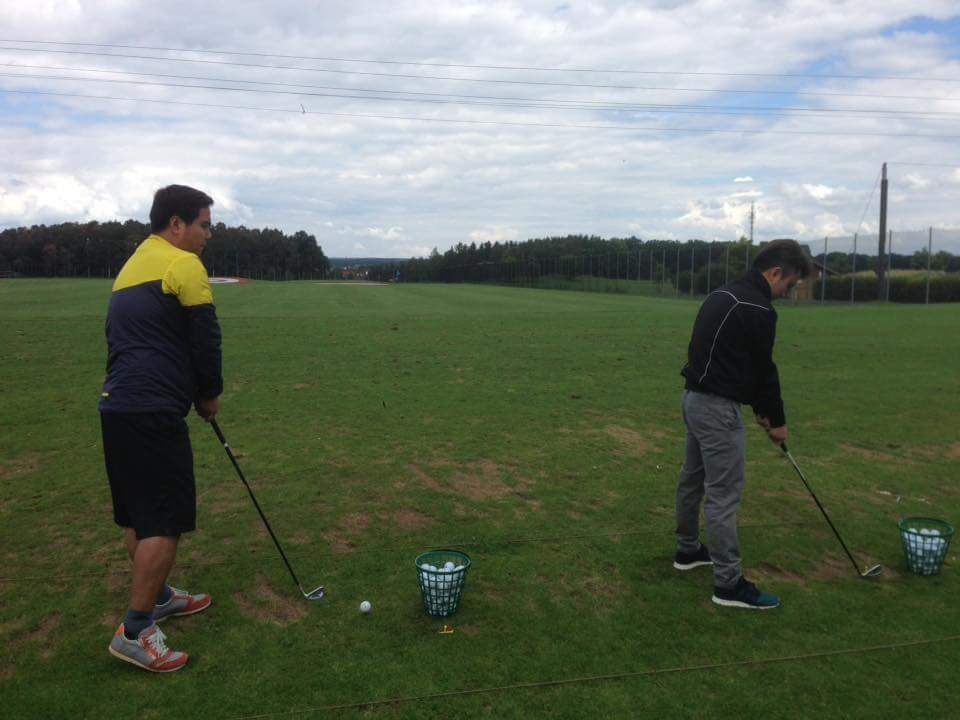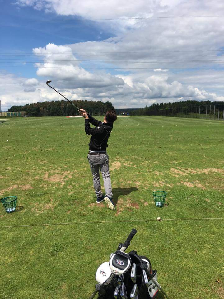 Um 13 Uhr ging es nach einer kurzen Einführung und Erklärung der Grundbegriffe direkt auf die Driving Range. Dort wurden uns erst mal die Schläger gezeigt und etwas die Unterschiede sowie Einsatzzwecke erklärt. Mit einem Eisen 6 durften wir uns dann in 2er Gruppen versuchen die Bälle aufs Feld zu befördern. Hört sich leichter an als es ist. Sicherlich hätte ich mit bei den ersten Schlägen den Ball mit Fingerschnippsen weiter nach vorne bekommen als mit dem bestimmt einen Meter langen Golfgerät in meinen Händen. :-) Aber Lukas stand als geduldiger und erfahrener Trainer ja mit Rat und Tat zur Verfügung. Dort stieß dann Julian Wuttke, auch Snooker-Spieler bei uns im Verein und erfahrener Golfer, zu unserer Gruppe dazu. Er arbeitet ebenfalls im Golfclub "Center of Excellence". Julian und Lukas führten uns dann auch immer einige Schläge vor damit wir uns eine Vorstellung davon machen konnten wie es richtig aussehen sollte. Nach etwas Übung klappte aber schon das eine oder andere.