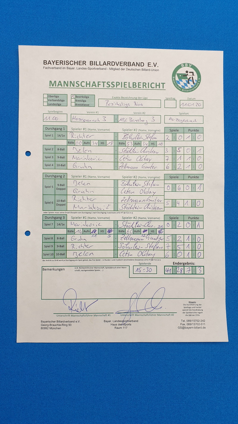 Jelen der auf Revenche brannte nach seinem Doppel, rannte förmlich zu einem 4:0 und lies hier auch nichts mehr anbrennen, er fegte Cetin mit 6:0 im 10 Ball von der Platte. Gruhn folgte im Takt der Musik und sicherte den Sieg mit einem 5:2 im 8 Ball gegen Zellmann. Marinkovic der auf eine Serie aus war im 14.1 kam einfach nicht ins Spiel und je mehr er versuchte um so mehr ging schief, Stöcklein methodisch und im Lauf, nahm was lag und nahm Punkt um Punkt bis er mit 60:14 schnell und deutlich den 3. und gleichzeitig letzten Sieg für Bamberg holen sollte. Klaus der wirklich stark spielte, sich viele kanppe und enge Partien holte und seine 100% Quote für diesen Spieltag klar machte, holte gegen seinen Hinrunden Gegner Böhnlein einen 7:5 Sieg im 9 Ball im Sack.