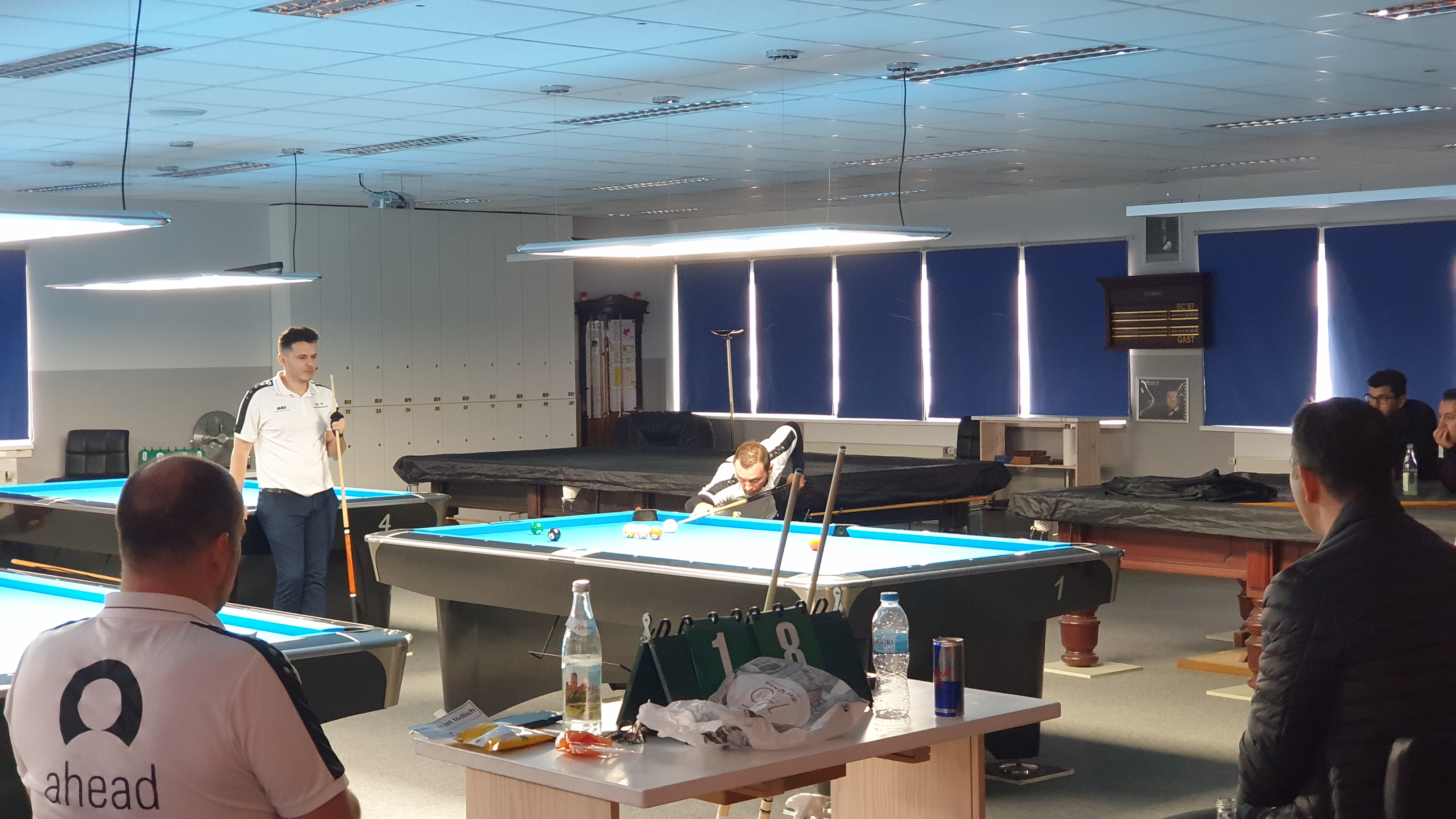 Im 14/ setzte sich Toni relativ schnell mit einem Punktevorsprung von über 40 Bällen ab. Ein paar mal musste er mit Safe aus der Partie aussteigen, da ihm die Fortsetzung nicht möglich bzw. zu riskant war, ansonsten ließ er während seiner Aufnahmen nichts anbrennen, gab die erspielte Führung mit einer darauffolgenden 27er Serie nicht mehr aus der Hand und konnte seine Partie souverän mit 100:43 in acht Aufnahmen für sich entscheiden. 1:0!! für uns.