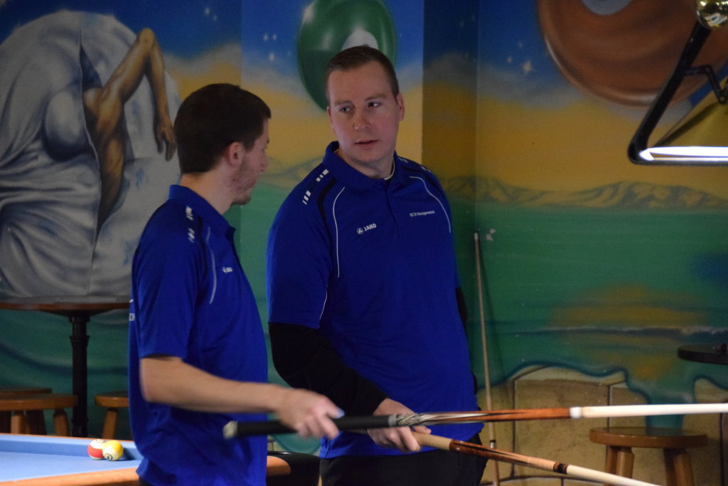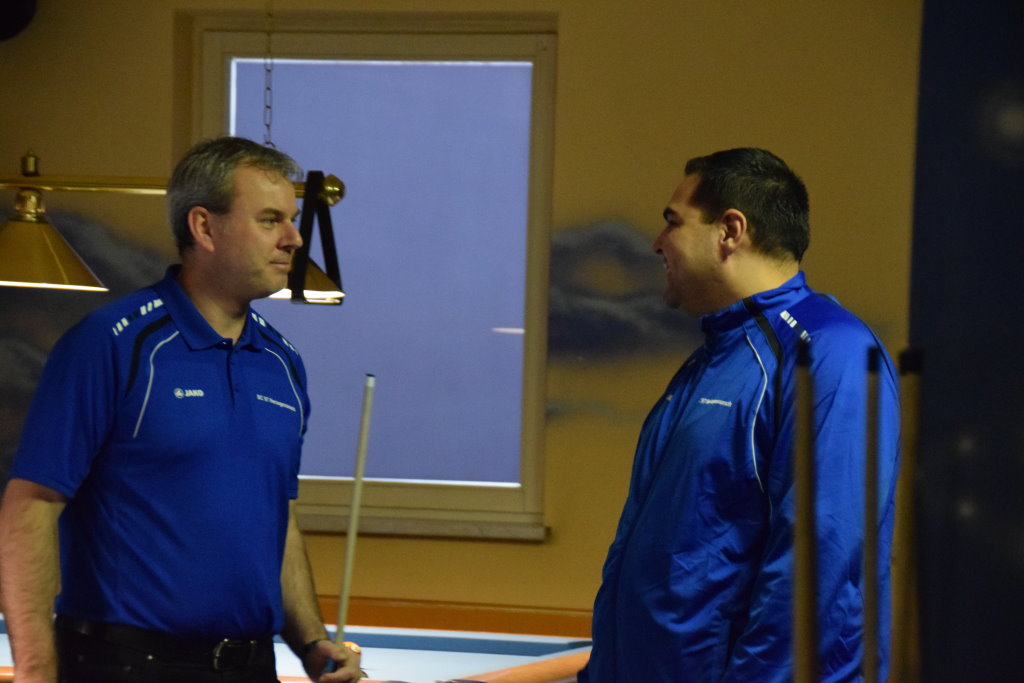 Für die ersten drei Partien hatten wir nun die Wahl zwischen zwei 14/1 Spielern, Klaus und Alex. Eigentlich wollte ich Alex den Vortritt fürs 14/1 lassen, aber vor Ort entschieden wir uns dann gemeinsam doch anders und ich sollte gegen Peter Maisser ins 14/1 starten, während Alex im 8-Ball gegen Roland Klee an den Start ging. Philipp und Lukas sollten im 10 Ball-Doppel gegen Hubert Fiedler und Wolfgang Beyerlein antreten. Luka setzte in dieser Runde daher aus. Das 14/1 startete ich mit einem nicht ganz geglückten Sicherheitsanstoß der von Peter direkt mit 5 Bällen gestraft wurde. Ich konterte aber direkt mit einer 18er Serie was vermutlich Peters Spielkonzept komplett ins Argen brachte. Die Partie ging recht offensiv weiter und konnte von mir dann klar in der 9ten Aufnahme heimgebracht werden. Alex marschierte ähnlich ambitioniert nach vorne wie ich. Die Anreise hatte ihn offenbar beflügelt und er konnte nahezu fehlerlos seinen Satz 4:1 gewinnen. Im Doppel schlugen sich Lukas und Philipp auch sehr erfolgreich und gewannen 4:2. Der Zwischenbericht in unsere WhatsApp Gruppe konnte daher 3:0 Führung für Herzogenaurach lauten!