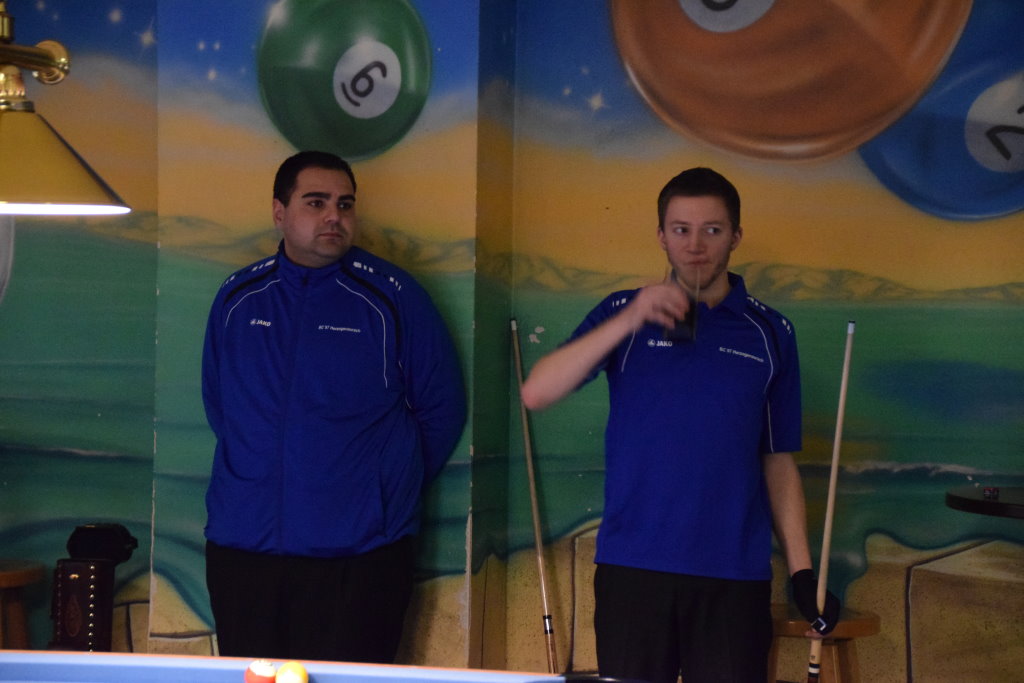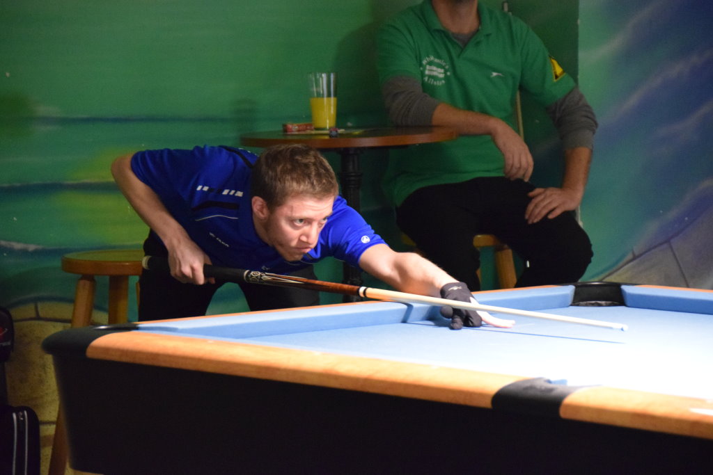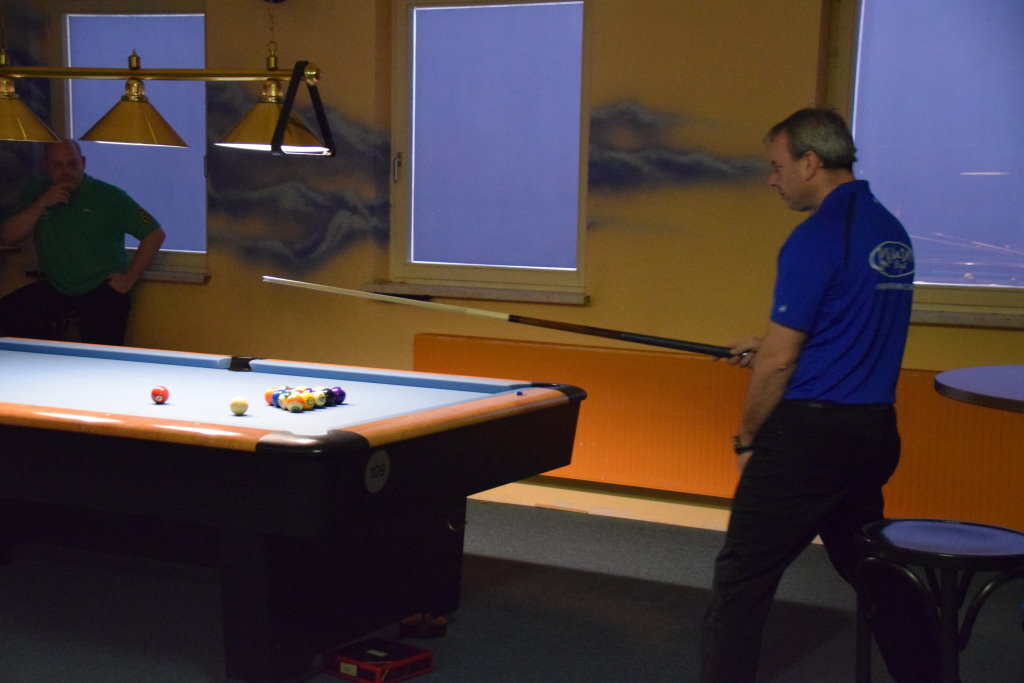 Der letzte Aufstellungsblock sollte nun Luka und Philipp in die Einzel bringen. Luka startet im 10-Ball gegen Peter, Philipp im 9-Ball gegen Roland. Ich setzte aus und Lukas und Alex spielten Doppel-8-Ball. Alex und Lukas harmonierten offenbar perfekt. Nahezu ohne Kommunikation spielten die beiden nahezu perfektes Billard. Richtig schön zuzusehen! 4:0 der Lohn solcher guten Harmonie. Luka hatte mit Peter einen sehr erfahrenen Gegner, der einmal ins Spiel gelassen nur noch schwer zu bremsen ist. Daher ein deutlicher 0:4 Verlust für Luka. Philipp konnte gut ins 9-Ball starten. Er gewinnt das Break, bleibt am Stoß, locht 1, locht 2 und spielt gezielt eine Kombi 3 auf 9 und geht in Führung. Leider sollte es dabei nicht bleiben, Roland erkannte seine Chancen und gewann an Sicherheit im Spiel, während Philipp manchmal mit zuviel Optimismus den einen oder anderen Ball lieber als Save hätte spielen sollen. Kurzum der Satz lief ziemlich ausgeglichen bis zum 3:3. Das letzte Spiel ging etwas hin und etwas her, Roland spielt noch die 7 und verstellt sich schwer auf die 8 kann aber eine gute Sicherheit ablegen. Philipp muss einen Vorbänder spielen den er nur knapp verfehlt. Mit Ball-in-Hand kann also Roland schließlich dieses erste Einzel von Philipp mit 4:3 gewinnen.